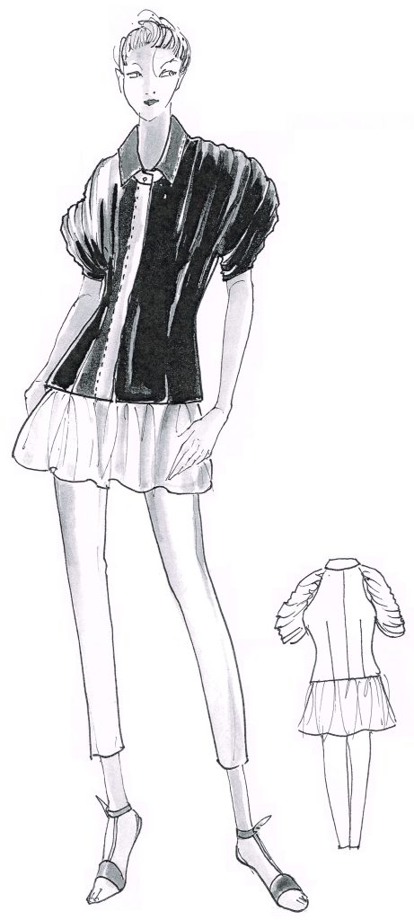 デザイン:ヨーク切替入りプリーツスカートとFに結びドレープ入りシャツブラウス。布:綿ピケ(スカート)、ポリエステル(ブラウス)